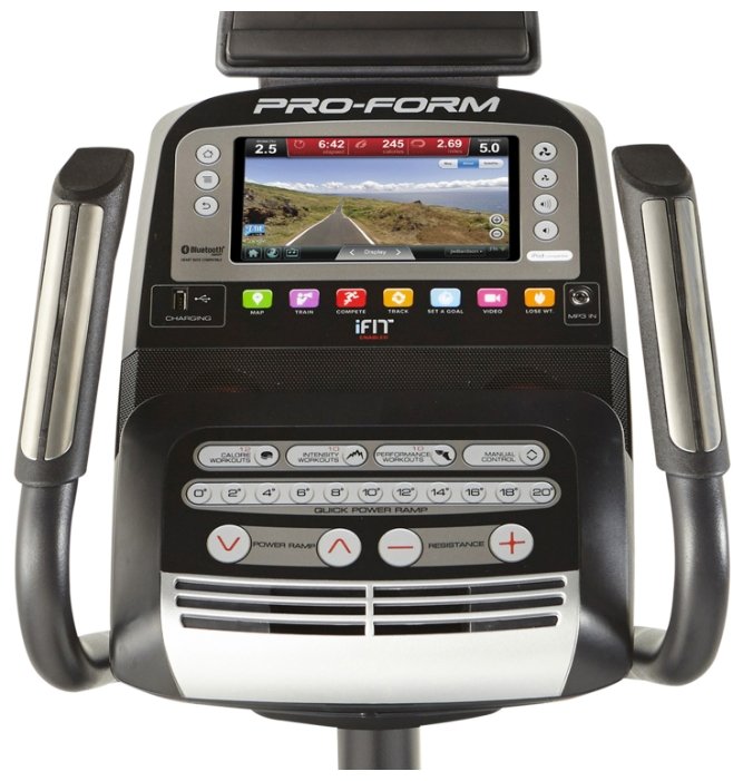 аудиоразъем 3.5, Bluetooth, порт-USB (для зарядки), Wi-Fi, загрузка тренировок, настраиваемые Google карты, сенсорный экран; виртуальный ландшафт; встроенные устройства: USB-порт, вентилятор, динамики; цветной монитор; подключение беспроводного кардиодатчика, смартфона; крепление кардиодатчика: на руле; тип кардиодатчика: встроенный; минимальный угол наклона платформ: 0 %; максимальный угол наклона платформ: 20 % |