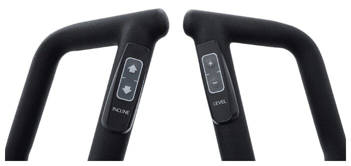 клавиши на рукоятках, компенсаторы неровности пола, подставка для стакана, регулировка угла наклона платформ, рычаги для рук, транспортировочные ролики/колеса |