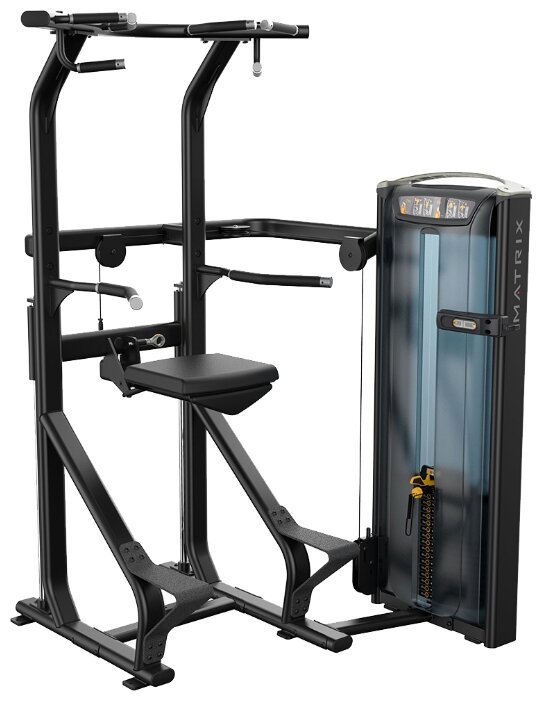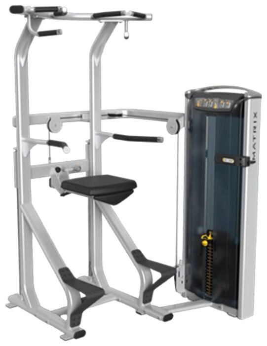 складывающаяся вверх подушка для коленей с фиксатором и гидравлическим амортизатором; четыре варианта хвата для подтягиваний; весовые плиты 4.5 и 6.8 кг |